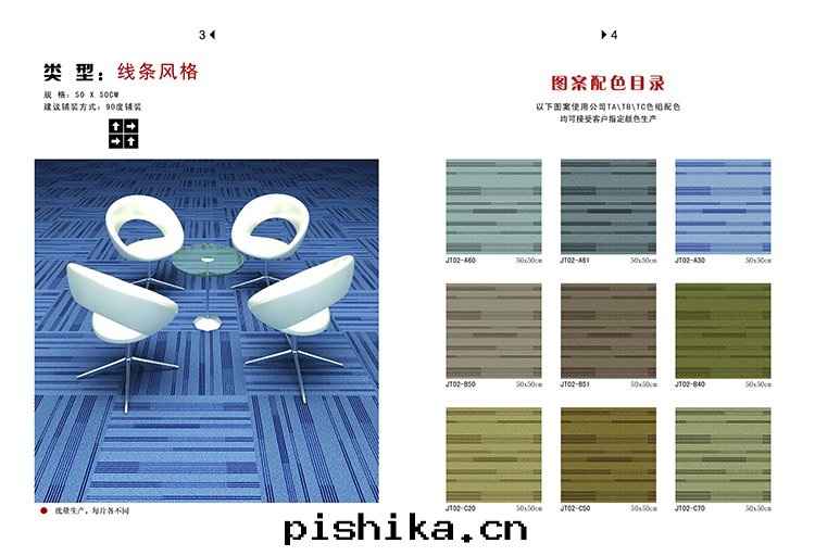 方(fāng)块(kuài)地(dì)毯(tǎn)是(shì)按照地(dì)毯(tǎn)的(de)鋪設方(fāng)法(fǎ)和(hé)形狀規格来(lái)劃(huà)分(fēn)的(de)一(yī)種(zhǒng)地(dì)毯(tǎn)品種(zhǒng),由(yóu)INTERFACE公(gōng)司的(de)荷蘭品牌(pái)Heuga于(yú)1955年(nián)發(fà)明並(bìng)推向(xiàng)市(shì)场(chǎng)。由(yóu)于(yú)地(dì)毯(tǎn)消費 的(de)明细(xì)化(huà),消費者(zhě)对(duì)地(dì)毯(tǎn)産品要(yào)求也(yě)日益多(duō)樣(yàng)。方(fāng)块(kuài)地(dì)毯(tǎn)按照使用(yòng)用(yòng)途可(kě)分(fēn)为图(tú)案(àn)块(kuài)毯(tǎn)和(hé)滿鋪块(kuài)毯(tǎn),图(tú)案(àn)块(kuài)毯(tǎn)主(zhǔ)要(yào)用(yòng)于(yú)室(shì)內(nèi)的(de)裝(zhuāng)饰和(hé)某一(yī)特(tè)定(dìng)位(wèi)置鋪垫(diàn),如工藝挂 毯(tǎn),廳毯(tǎn),茶(chá)几毯(tǎn),門(mén)毯(tǎn)等。滿鋪块(kuài)毯(tǎn)的(de)主(zhǔ)要(yào)用(yòng)途和(hé)其(qí)他(tā)機(jī)制地(dì)毯(tǎn)是(shì)一(yī)樣(yàng)的(de),都是(shì)以(yǐ)地(dì)面(miàn)鋪設的(de)方(fāng)式来(lái)达(dá)到(dào)静(jìng)音,舒适,美(měi)觀的(de)地(dì)面(miàn)效果(guǒ)。由(yóu)于(yú)鋪設方(fāng)法(fǎ)簡單方(fāng)便和(hé) 形狀小巧,这(zhè)種(zhǒng)地(dì)毯(tǎn)在(zài)辦(bàn)公(gōng)室(shì),機(jī)房(fáng)等地(dì)非(fēi)常受欢迎。方(fāng)块(kuài)地(dì)毯(tǎn)的(de)規格比較小,一(yī)般为50cm*50cm或(huò)者(zhě)60cm*60cm,以(yǐ)大(dà)量的(de)拼合来(lái)鋪設地(dì)面(miàn),所(suǒ) 以(yǐ)也(yě)叫拼块(kuài)地(dì)毯(tǎn)。